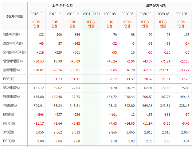 2020년 매출액 354억 원 / 영업이익 -142억 원 / 당기순이익 -301억 원 / ROE -41.41%